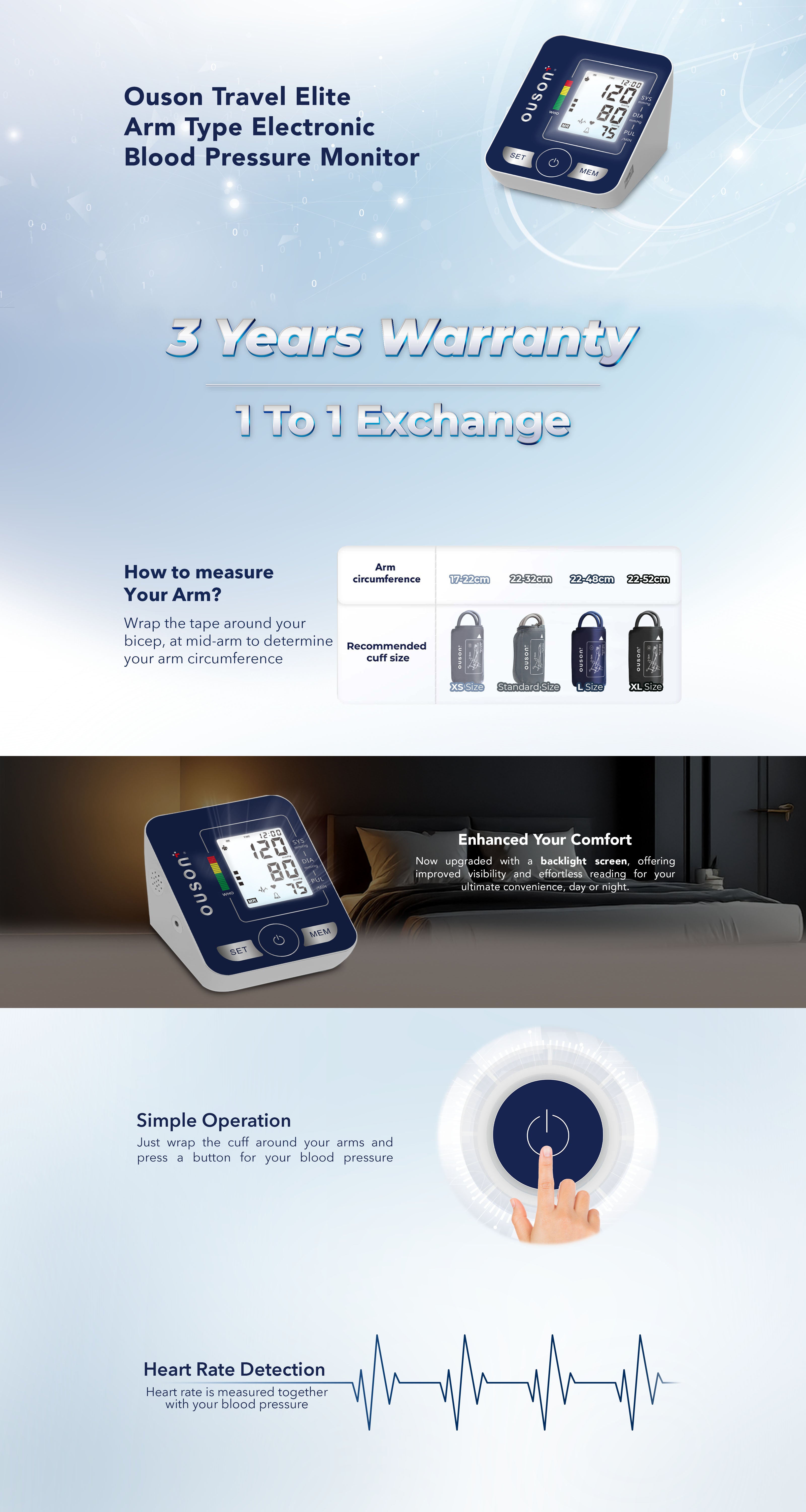 Ouson Travel Lite Backlight XS Size (17cm-22cm) Arm Type Electronic Blood Pressure Monitor